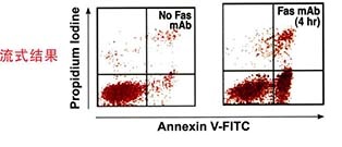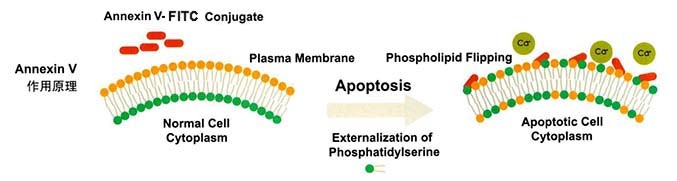 细胞凋亡是细胞根据自身程序结束其生命的主动死亡的过程, 具有特征的形态和生化改变,如细胞皱缩、骨架瓦解、核膜解体、染色质皱缩、 DNA片段化、凋亡小体形成。细胞凋亡分析一般采用FITC标记的膜联蛋白(AnnexinV)染色细胞。磷脂酰丝氨酸(PS)通常只存在于质膜内侧, 在细胞凋亡早期,细胞膜外翻,可被AnnexinV-FITC染色,由于 此时细胞膜仍未失去整合性,PI无法进入细胞。在细胞凋亡晚期, 膜的整合性发生改变,PI才能进入细胞染色。根据荧光颜色的不同,可被不同的检测器接收,进行荧光分析。