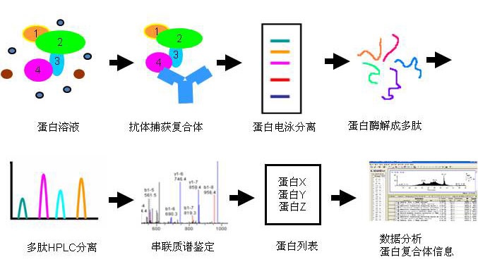 解析和鉴定蛋白质复合体的最常用方法是利用抗体做免疫共沉淀分离复合体,再使用质谱方法鉴定蛋白质复合体的组成成分并研究相关蛋白质的功能。